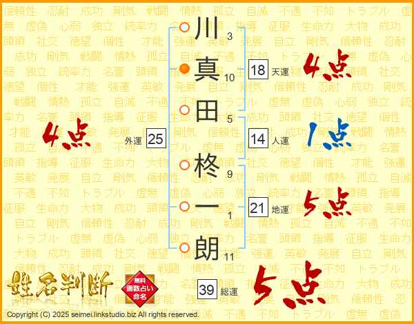 川(3画)真(10画)田(5画) 柊(9画)一(1画)朗(11画)