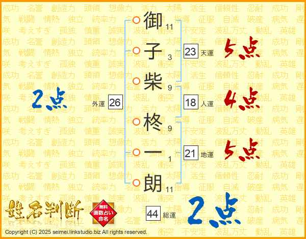 御(11画)子(3画)柴(9画) 柊(9画)一(1画)朗(11画)
