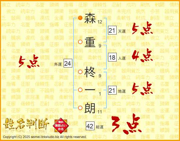 森(12画)重(9画) 柊(9画)一(1画)朗(11画)