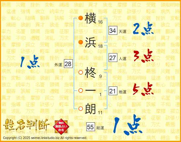 横(16画)浜(18画) 柊(9画)一(1画)朗(11画)