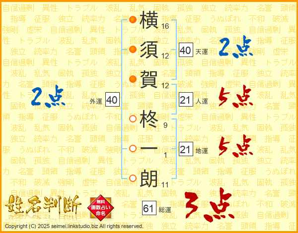 横(16画)須(12画)賀(12画) 柊(9画)一(1画)朗(11画)