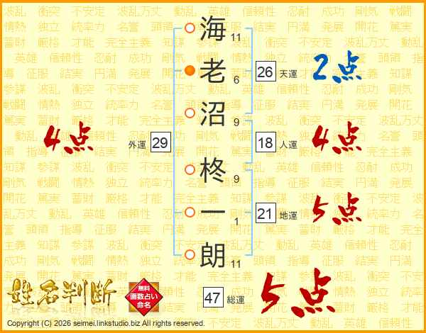 海(11画)老(6画)沼(9画) 柊(9画)一(1画)朗(11画)