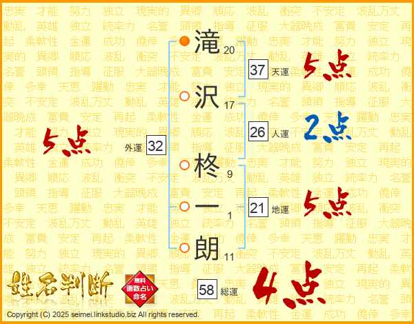 滝(20画)沢(17画) 柊(9画)一(1画)朗(11画)