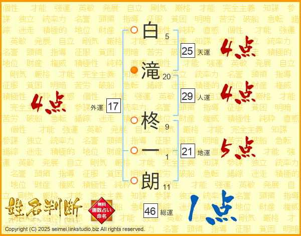 白(5画)滝(20画) 柊(9画)一(1画)朗(11画)
