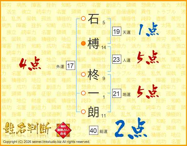 石(5画)榑(14画) 柊(9画)一(1画)朗(11画)