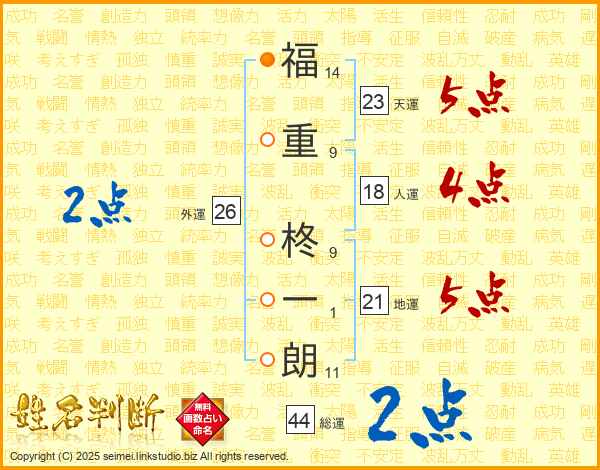 福(14画)重(9画) 柊(9画)一(1画)朗(11画)