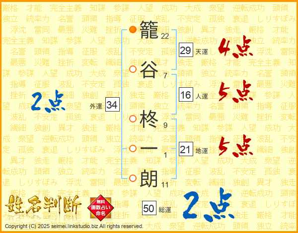 籠(22画)谷(7画) 柊(9画)一(1画)朗(11画)