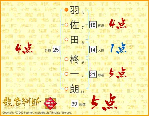 羽(6画)佐(7画)田(5画) 柊(9画)一(1画)朗(11画)