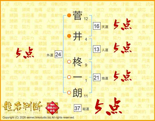 菅(12画)井(4画) 柊(9画)一(1画)朗(11画)