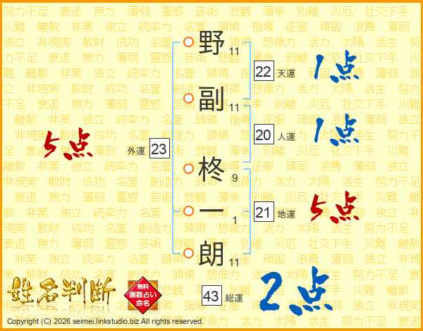 野(11画)副(11画) 柊(9画)一(1画)朗(11画)