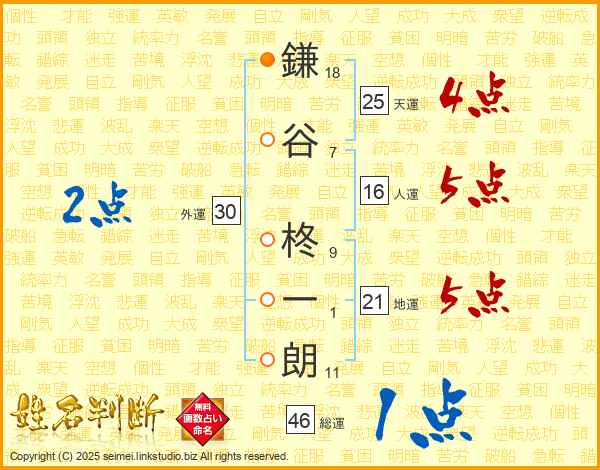 鎌(18画)谷(7画) 柊(9画)一(1画)朗(11画)