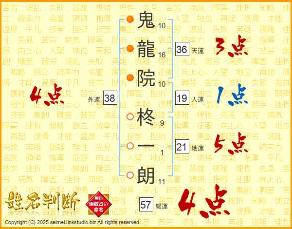 鬼龍院柊一朗さんの総運は57画の4点!