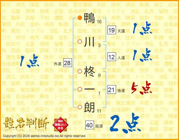 鴨(16画)川(3画) 柊(9画)一(1画)朗(11画)