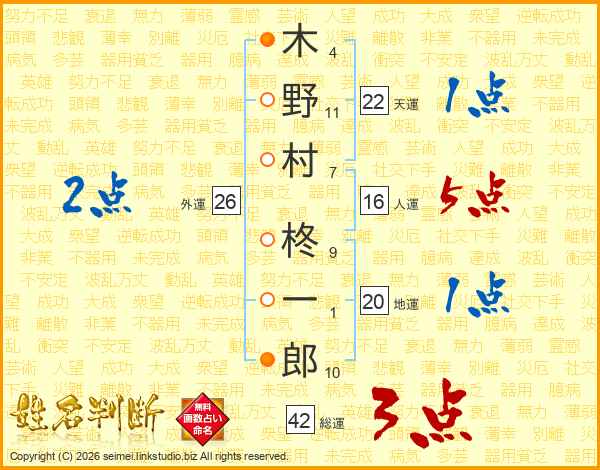 木(4画)野(11画)村(7画) 柊(9画)一(1画)郎(10画)