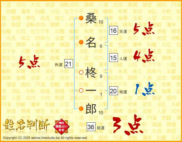 桑(10画)名(6画) 柊(9画)一(1画)郎(10画)