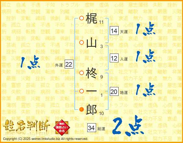 梶(11画)山(3画) 柊(9画)一(1画)郎(10画)