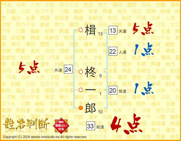 楫柊一郎さんの総運は33画の4点!