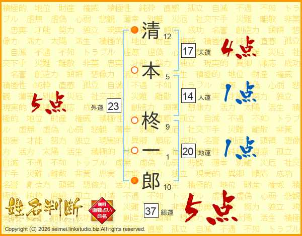 清(12画)本(5画) 柊(9画)一(1画)郎(10画)