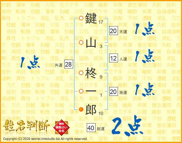 鍵(17画)山(3画) 柊(9画)一(1画)郎(10画)