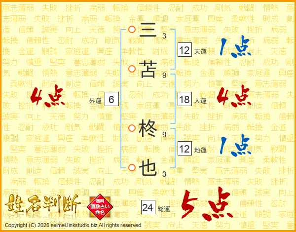 生活面を象徴する運勢です。外部から受ける影響力を表し、結婚運、家庭運や職場、環境への順応性を表します。総運から人運を引いた画数。姓や名が1文字の場合を除く。