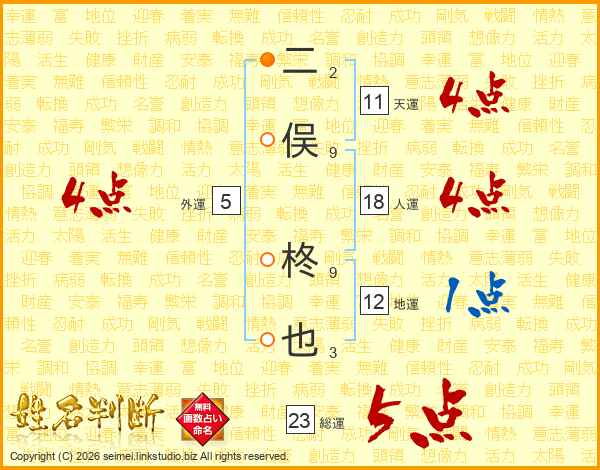 生活面を象徴する運勢です。外部から受ける影響力を表し、結婚運、家庭運や職場、環境への順応性を表します。総運から人運を引いた画数。姓や名が1文字の場合を除く。