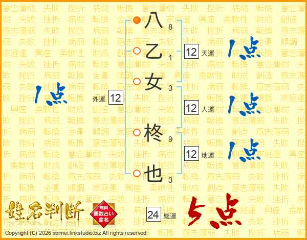 八乙女柊也さんの総運は24画の5点!