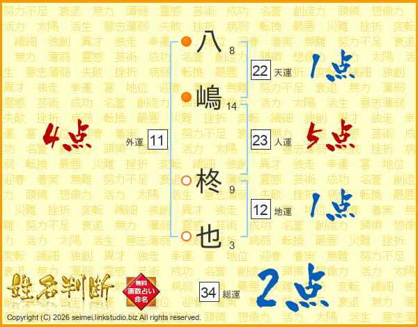 八(8画)嶋(14画) 柊(9画)也(3画)