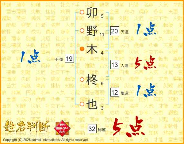 卯野木柊也さんの総運は32画の5点!