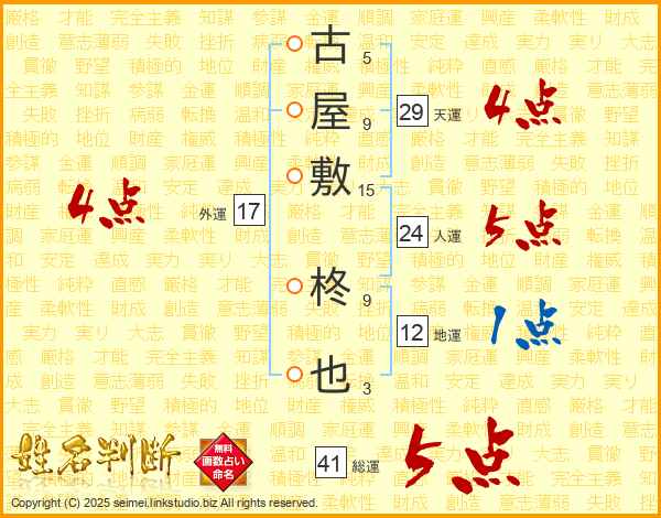 古(5画)屋(9画)敷(15画) 柊(9画)也(3画)