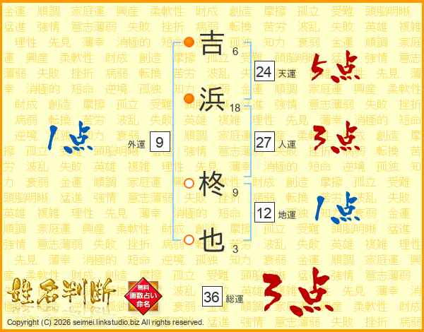 吉(6画)浜(18画) 柊(9画)也(3画)