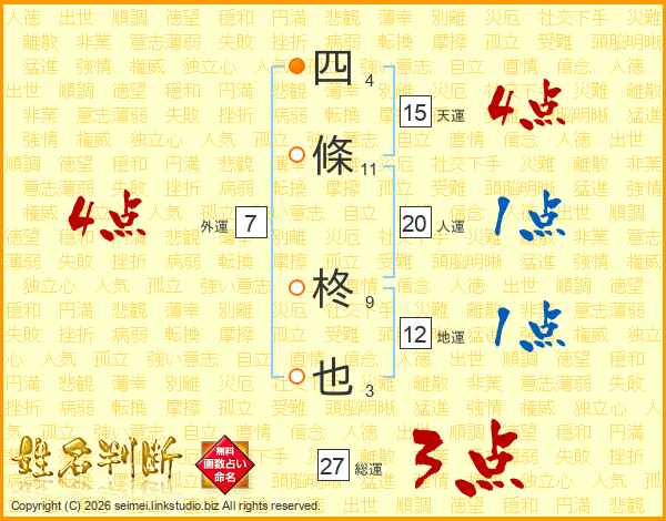 家系が持つ宿命的な運勢を表します。祖先から受け継いだ苗字ですので自分の力が及びません。家柄を象徴します。苗字の合計画数。