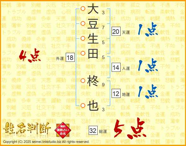 大(3画)豆(7画)生(5画)田(5画) 柊(9画)也(3画)