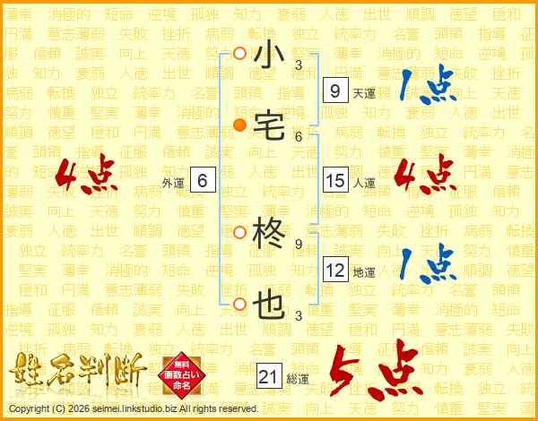 小宅柊也さんの総運は21画の5点!