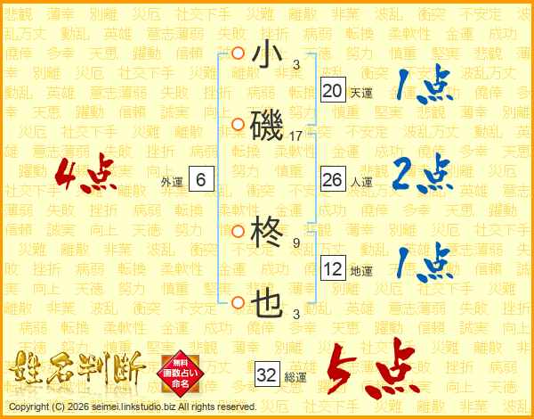 生活面を象徴する運勢です。外部から受ける影響力を表し、結婚運、家庭運や職場、環境への順応性を表します。総運から人運を引いた画数。姓や名が1文字の場合を除く。