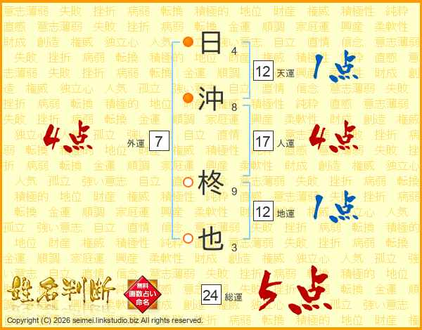 生活面を象徴する運勢です。外部から受ける影響力を表し、結婚運、家庭運や職場、環境への順応性を表します。総運から人運を引いた画数。姓や名が1文字の場合を除く。