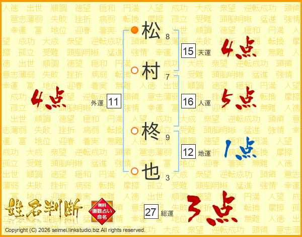 あなたの人生を表す1番重要な運勢です。生涯を通じて影響する総合運となり、主に50歳以降の晩年期に影響を及ぼします。苗字と名前の合計画数。