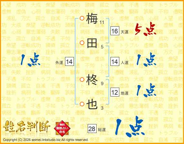 生活面を象徴する運勢です。外部から受ける影響力を表し、結婚運、家庭運や職場、環境への順応性を表します。総運から人運を引いた画数。姓や名が1文字の場合を除く。