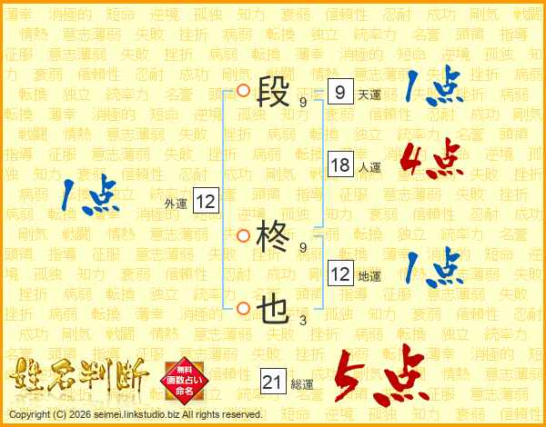 あなたの人生を表す1番重要な運勢です。生涯を通じて影響する総合運となり、主に50歳以降の晩年期に影響を及ぼします。苗字と名前の合計画数。