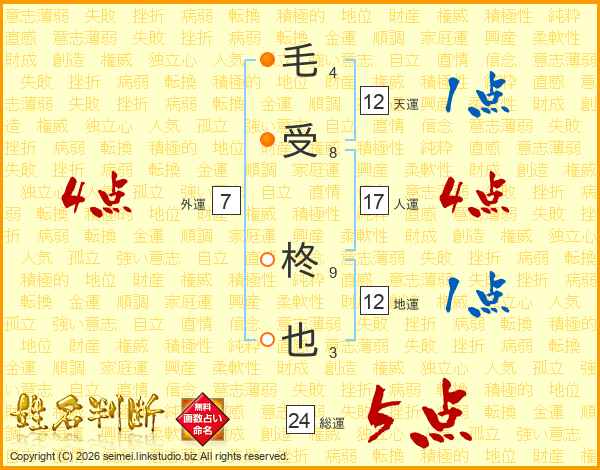 生活面を象徴する運勢です。外部から受ける影響力を表し、結婚運、家庭運や職場、環境への順応性を表します。総運から人運を引いた画数。姓や名が1文字の場合を除く。