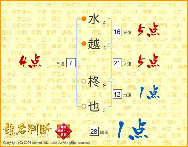 水(4画)越(12画) 柊(9画)也(3画)