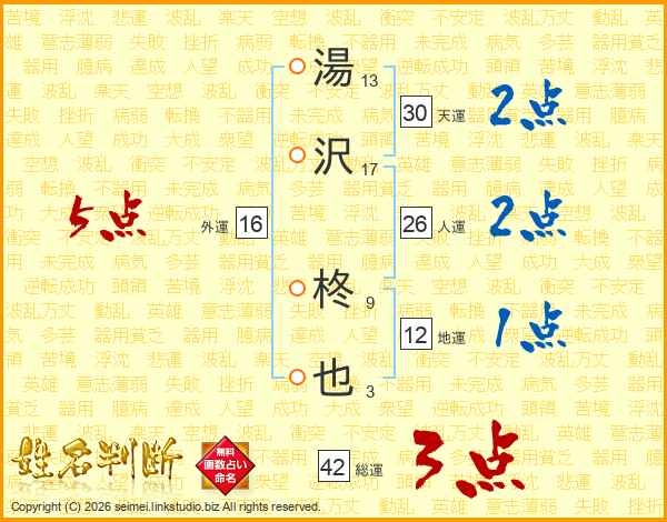 湯(13画)沢(17画) 柊(9画)也(3画)