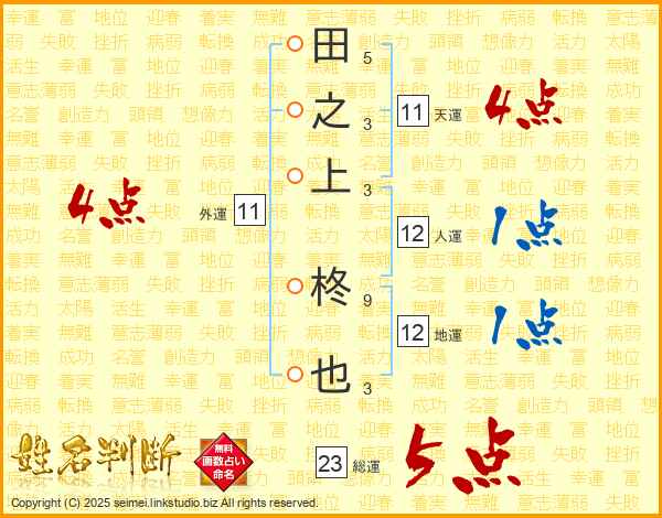 田(5画)之(3画)上(3画) 柊(9画)也(3画)