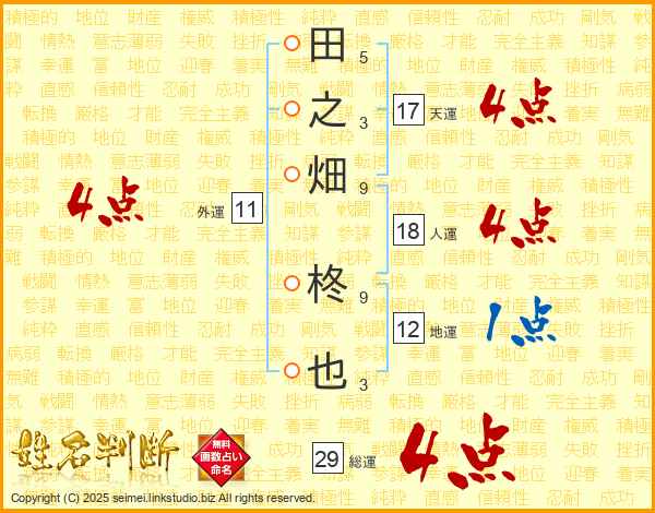 田(5画)之(3画)畑(9画) 柊(9画)也(3画)
