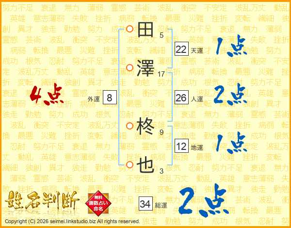 生活面を象徴する運勢です。外部から受ける影響力を表し、結婚運、家庭運や職場、環境への順応性を表します。総運から人運を引いた画数。姓や名が1文字の場合を除く。