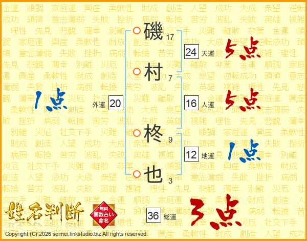 生活面を象徴する運勢です。外部から受ける影響力を表し、結婚運、家庭運や職場、環境への順応性を表します。総運から人運を引いた画数。姓や名が1文字の場合を除く。