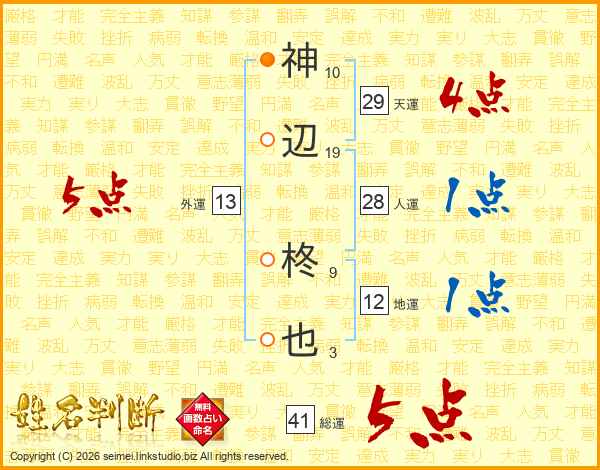 生活面を象徴する運勢です。外部から受ける影響力を表し、結婚運、家庭運や職場、環境への順応性を表します。総運から人運を引いた画数。姓や名が1文字の場合を除く。