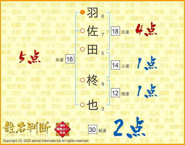 羽(6画)佐(7画)田(5画) 柊(9画)也(3画)