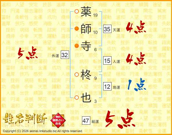 薬(19画)師(10画)寺(6画) 柊(9画)也(3画)