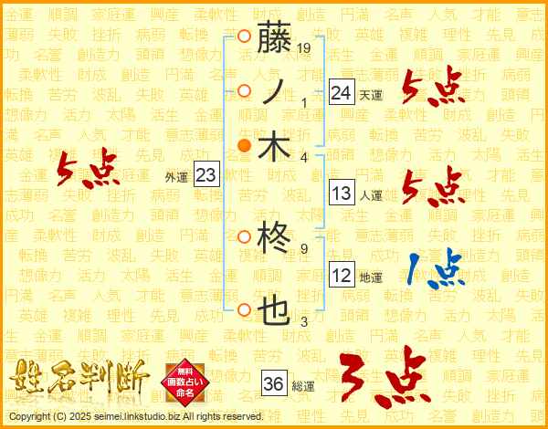 藤(19画)ノ(1画)木(4画) 柊(9画)也(3画)