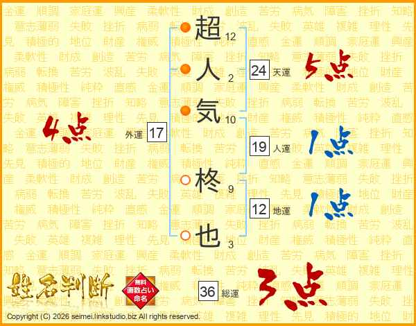 超(12画)人(2画)気(10画) 柊(9画)也(3画)